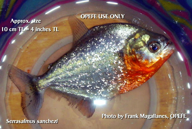 Serrasalmus sanchezi(Géry 1964, Río Ucayali, Perú); también conocida por el nombre de Piraña roja rubí, Piraña Diamante...